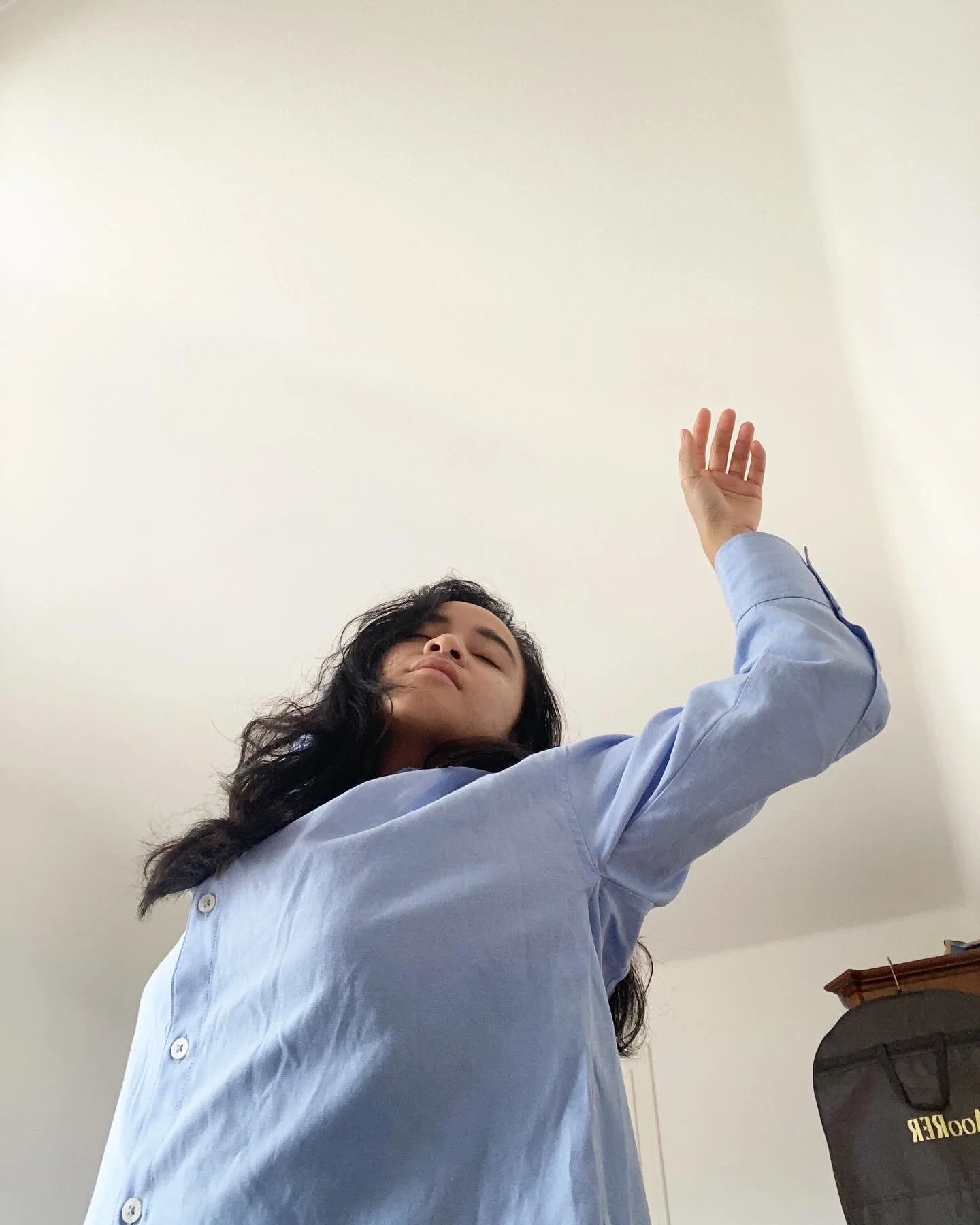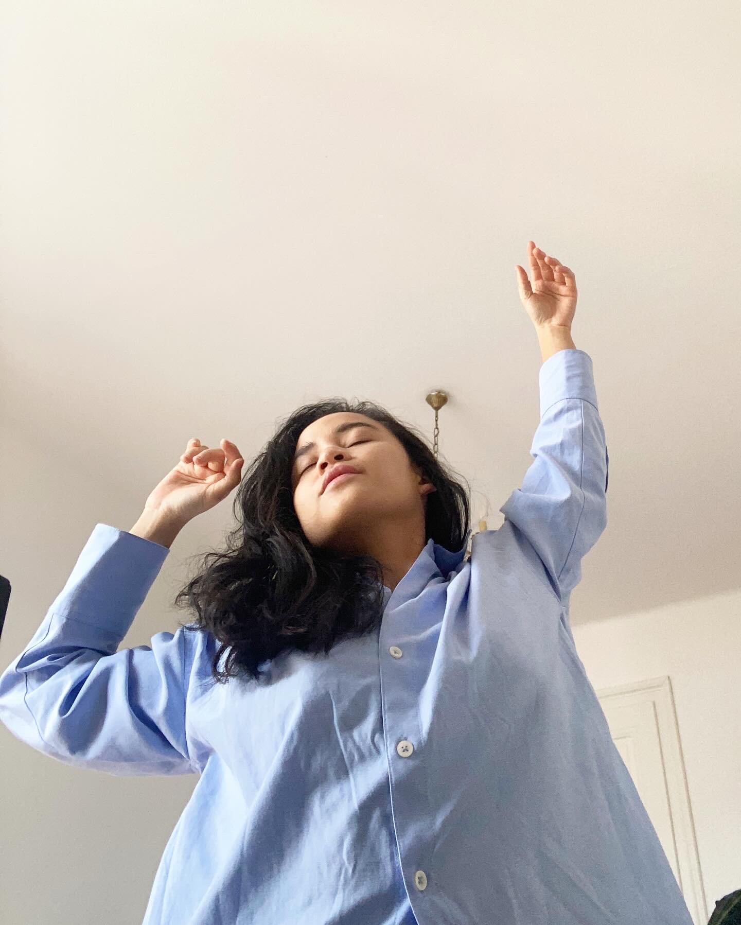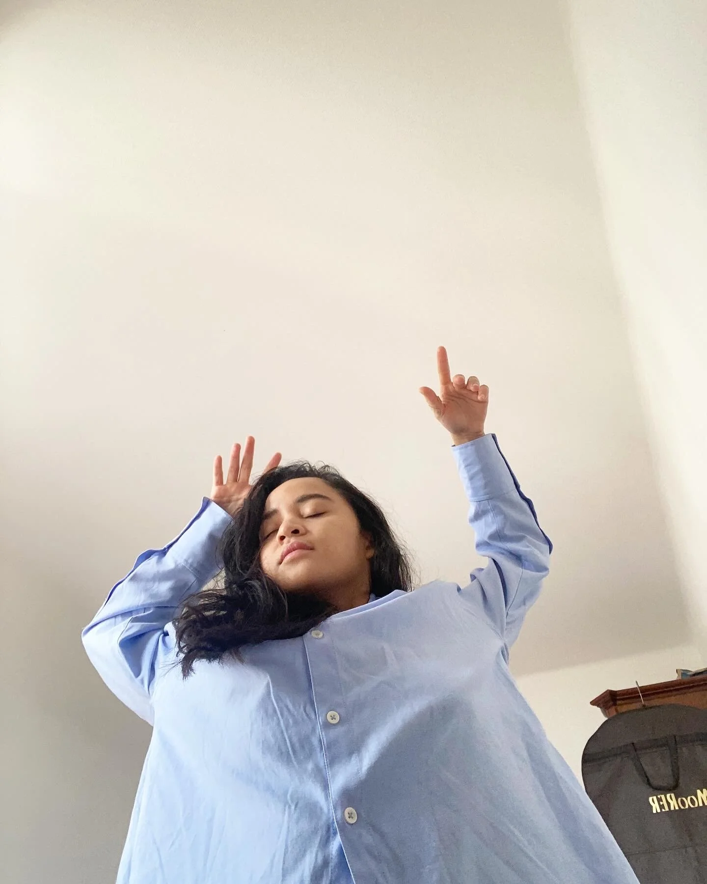 A rhythmless dance, captured on a grainy front camera, reinterpreted on a canvas. A selfie for the ages, or a manifestation of a lucid dream? A girl lives and dreams in the fluidity of her own body, melting away a portal out of her reality.