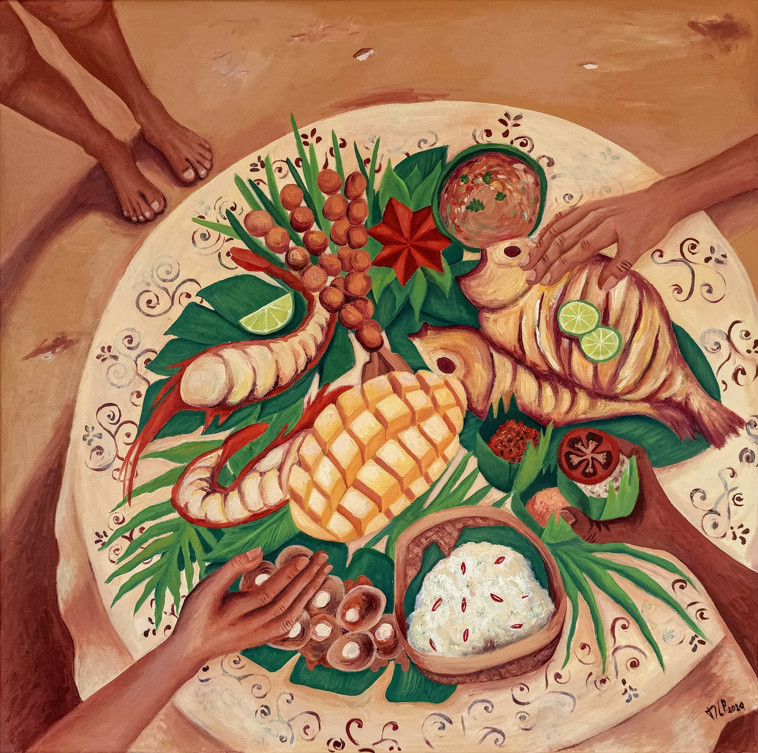 Born in the summer of 2024, this painting is a celebration of shared meals, a staple of the Indonesian culture in which I was raised. Having moved between several different countries, I’ve realised that a great deal can be learned from a community’s perspectives on food—how it is shared (or not shared), the rituals that surround it, and the spaces it creates for social interactions. Even as I adapt to the different cultures that I’ve been exposed to, the act of sharing and experiencing food as a communal activity has stuck with me through the years. As Christopher McCandless’ famous quote goes; “Happiness only real when shared”. A feast is only a feast when shared.